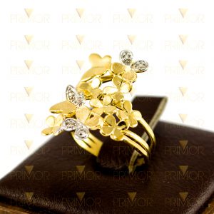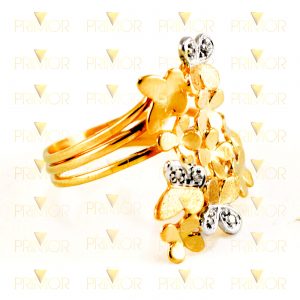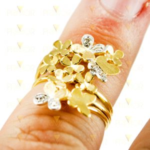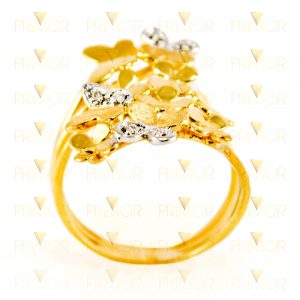 Anel todo em ouro amarelo com flores com design estilizado, diamantes de 1 ponto e banho de ródio para embelezar ainda mais a peça.