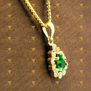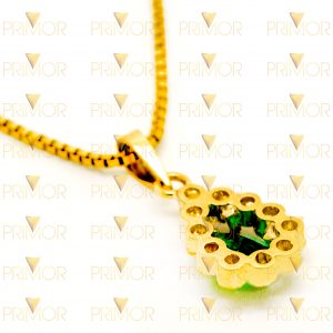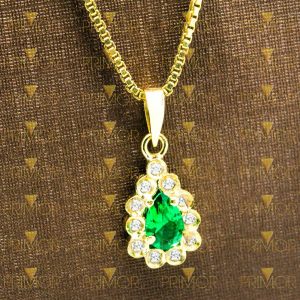 Peça maravilhosa que pode fazer conjunto com brincos lindos que também possuímos em nossa loja. O pingente possui linda esmeralda central (natural ou sintética) no formato gota e ao seu redor 11 pedras que tornam a joia mais linda ainda!